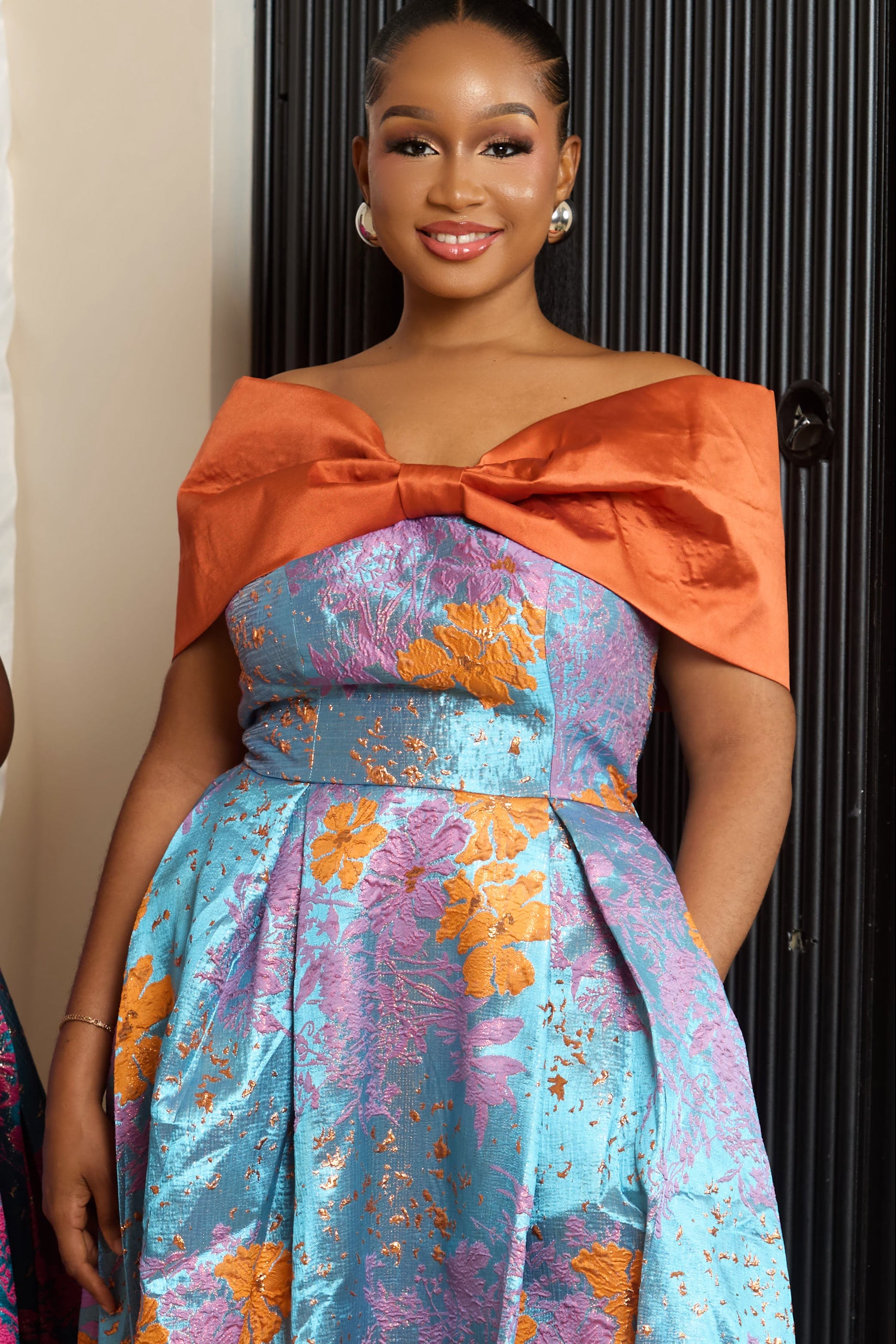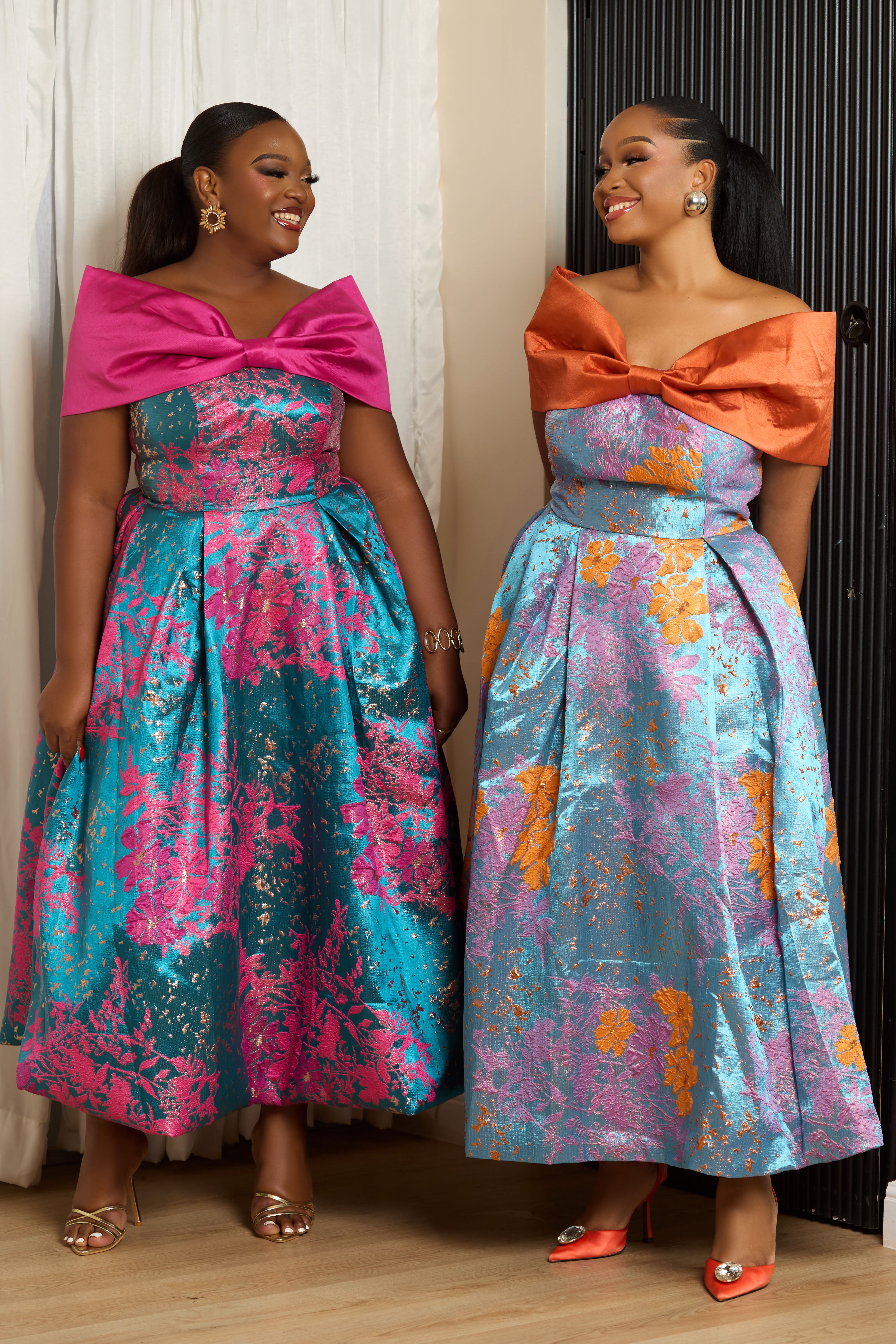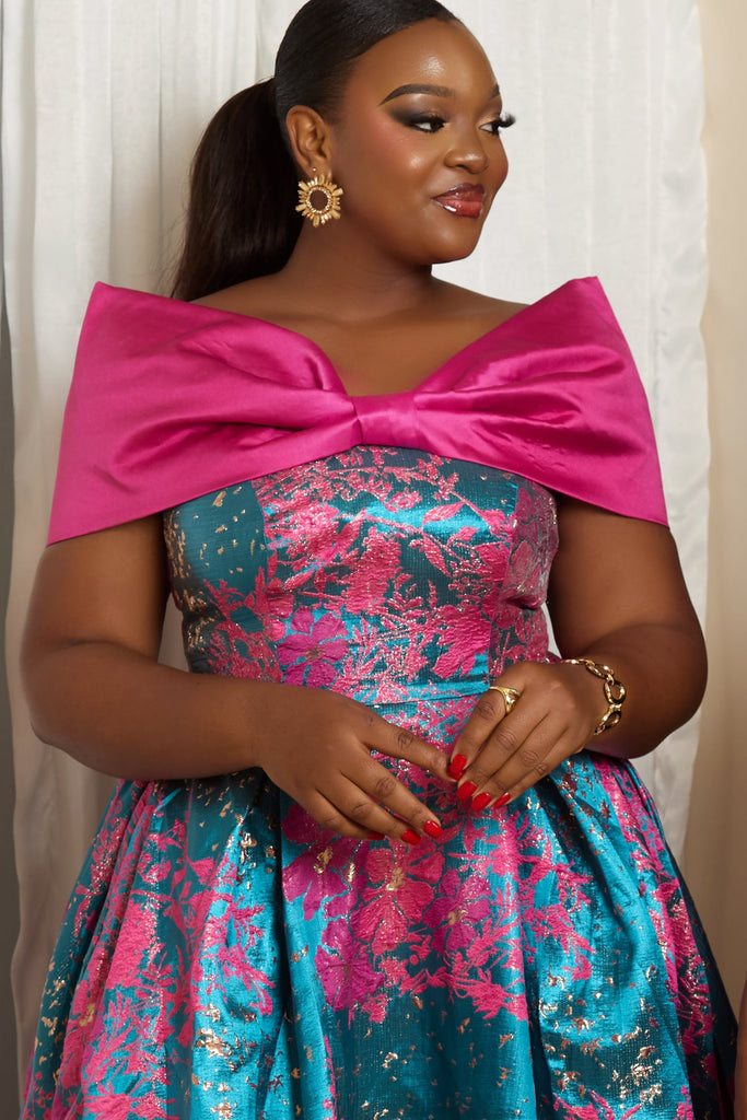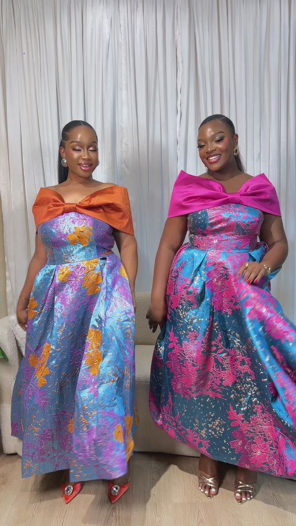 The ADAEZE Brocade Dress blends timeless elegance with modern design, featuring a dramatic bow at the neckline that adds sophisticated charm. Perfect for weddings, parties, or formal events, this dress ensures you stand out with confidence. Complete your look with heels and statement earrings for an effortlessly graceful ensemble.