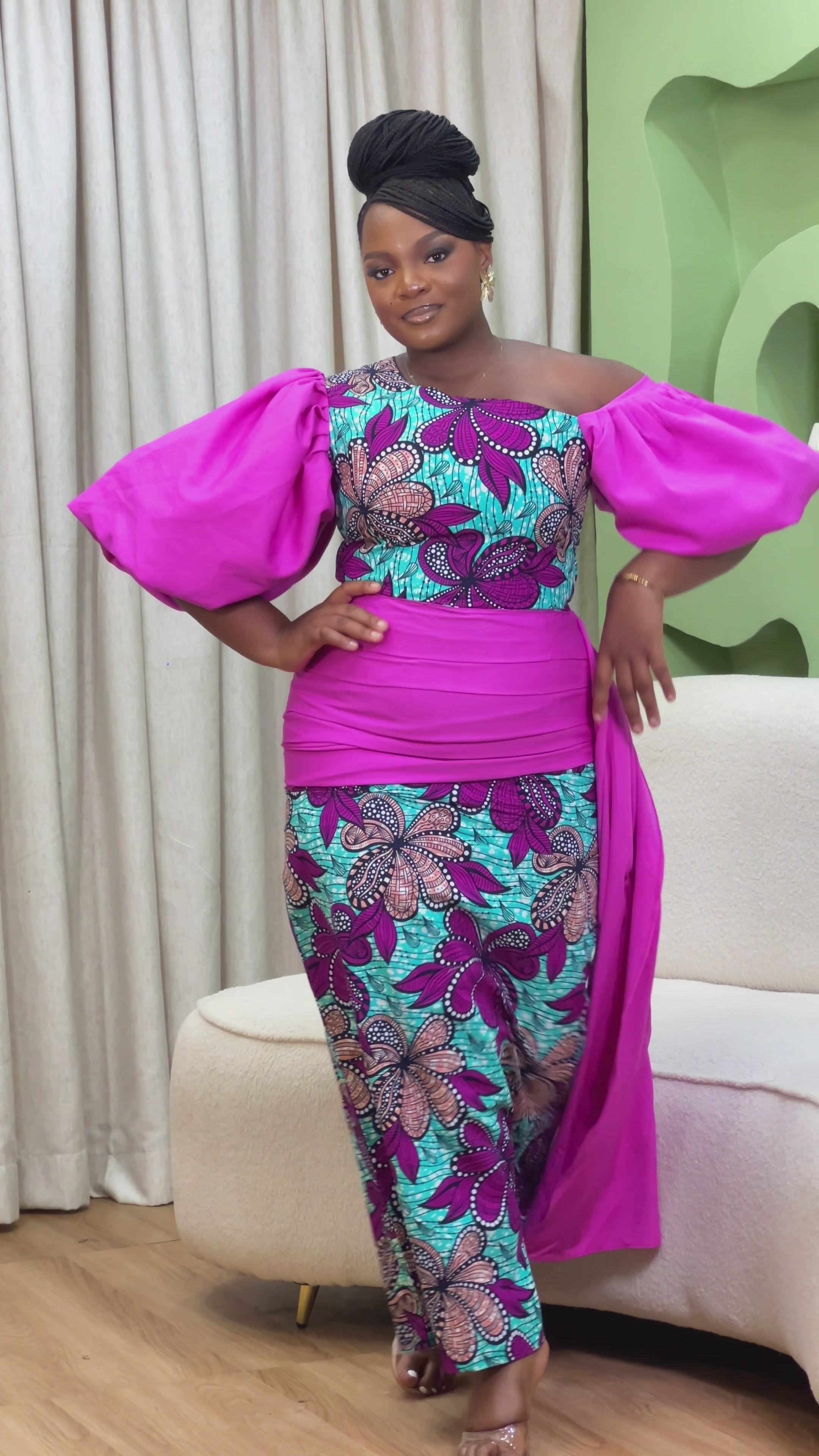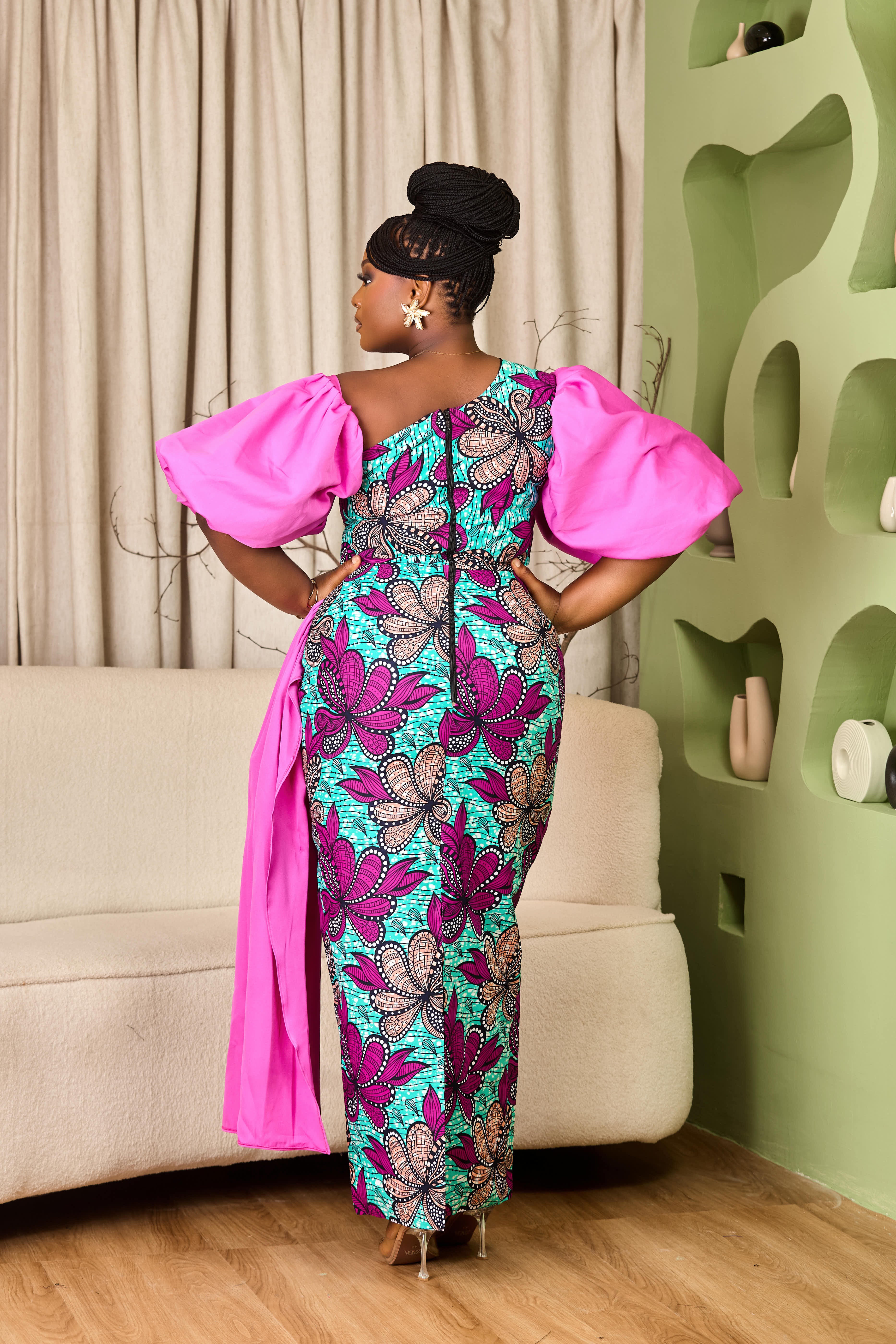 The Omolewa Dress is that perfect mix of bold and beautiful. Made with high-quality Ankara fabric, it features a one-shoulder neckline with statement puff sleeves in bright pink that add a fun, feminine touch.