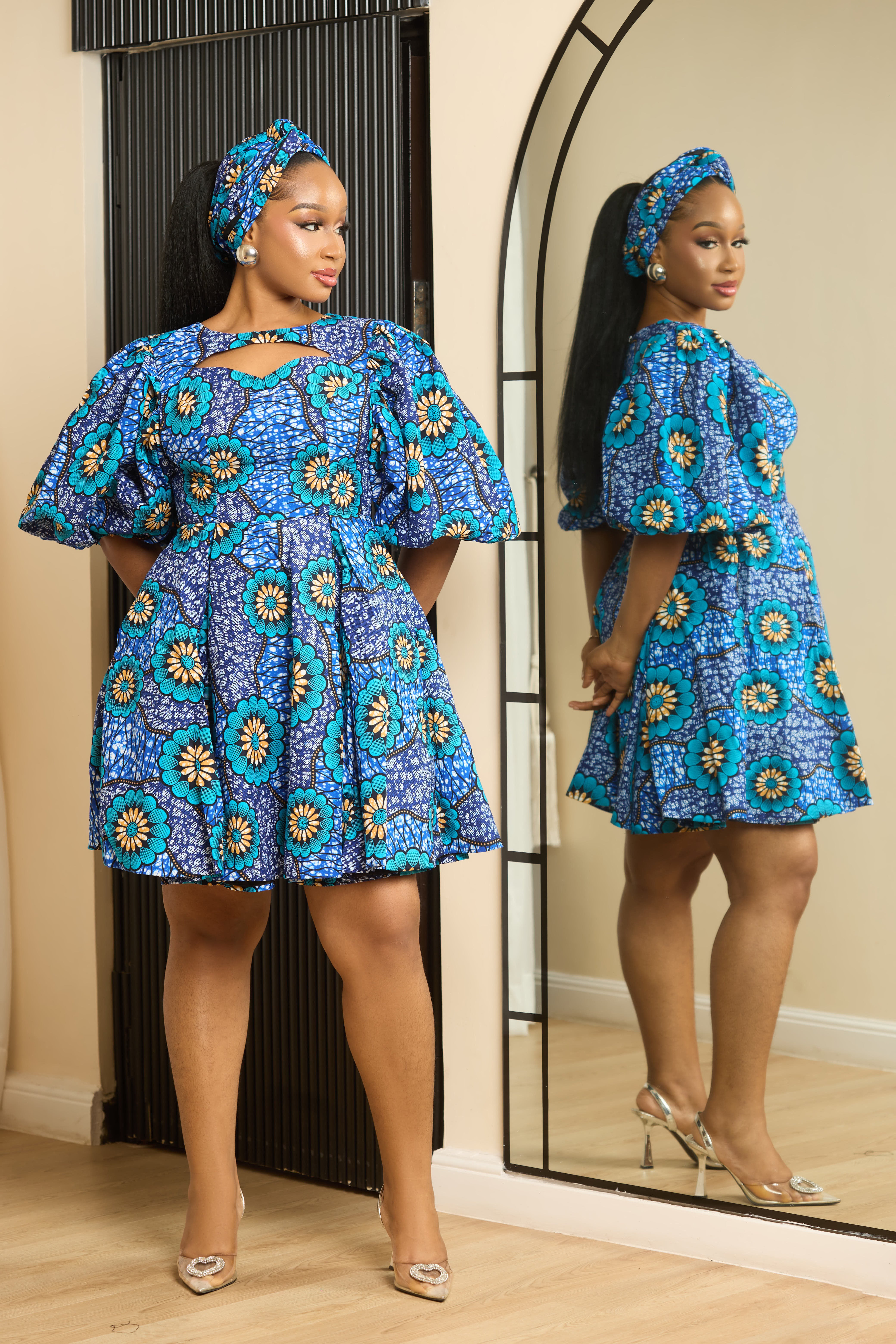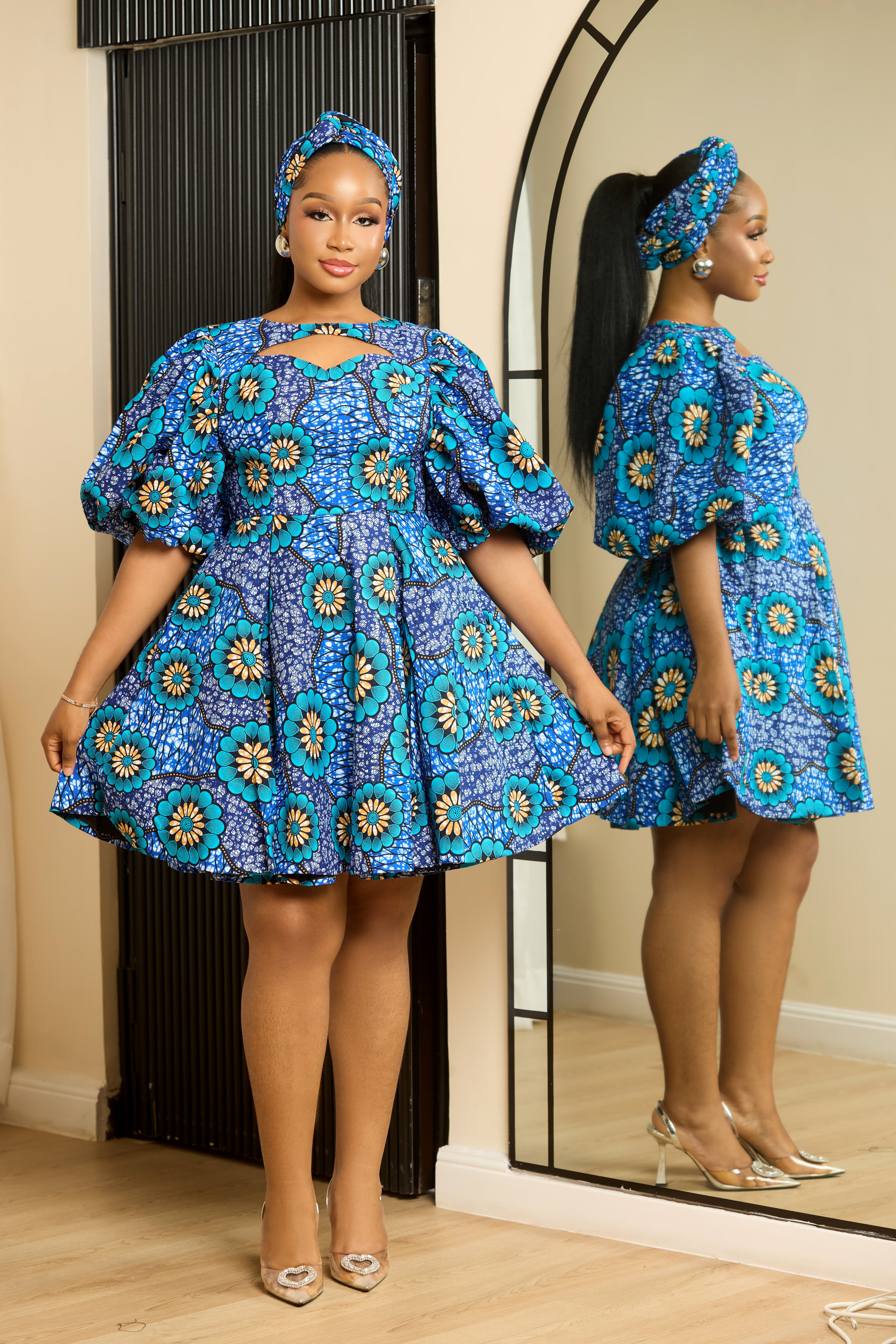 The Temilola Dress is made with, high-quality African print fabric combined with stylish puffy sleeves for a fashionable look. It has a trendy chest cut-out design and convenient pockets, perfectly balanced with a back zipper for easy wear and a flattering fit. This dress offers a modern twist on classic elegance. Does not comes with scarf