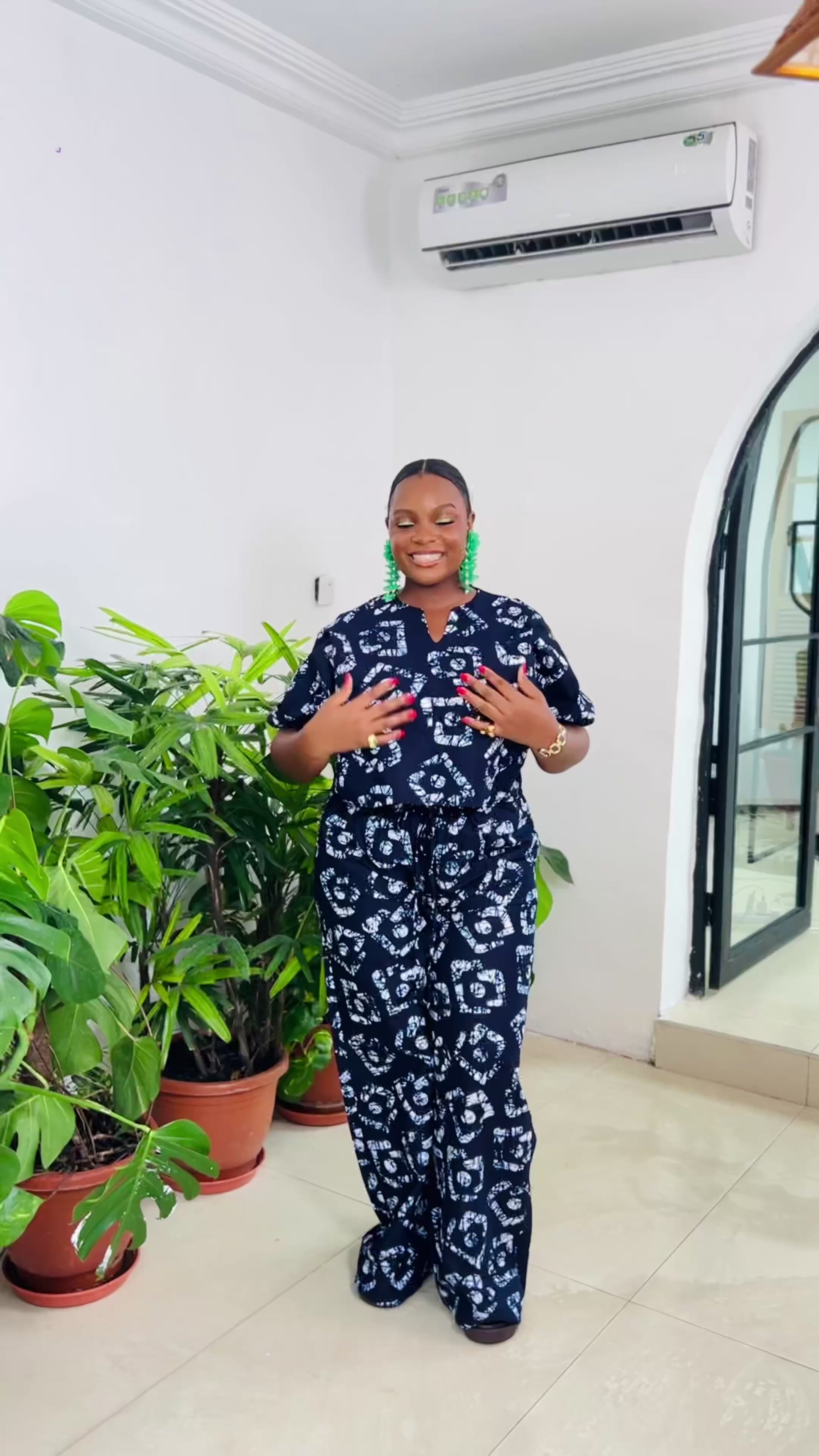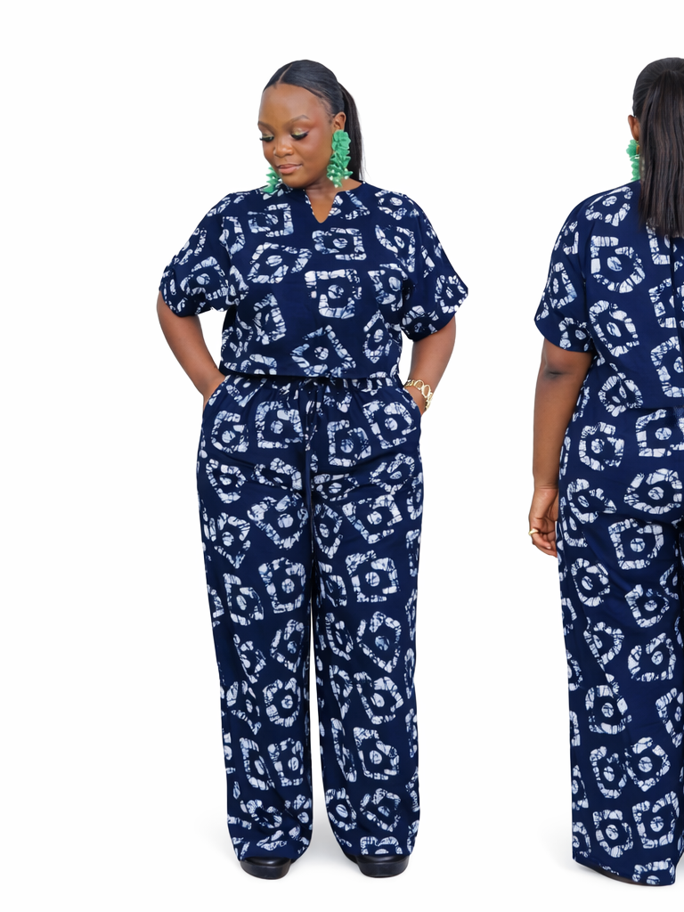 Our Navy Adire Two-Piece Set is that easy statement outfit you’ll keep reaching for. Crafted from breathable Adire fabric, this set features a relaxed cropped top with a subtle V-neckline and wide sleeves, paired with high-waist wide-leg trousers for a flattering, comfortable fit.
