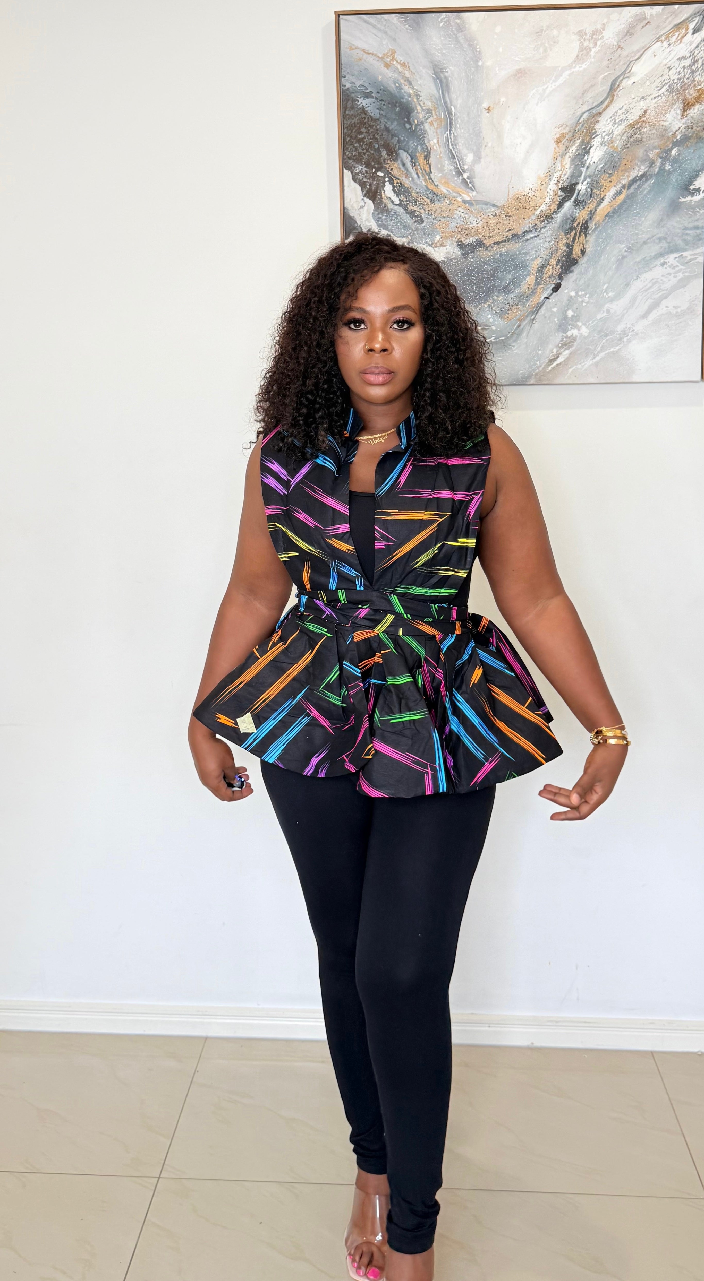 The KAIRA Peplum Top is that easy mix of classy and playful — perfect for when you want to dress up without trying too hard. Made from quality Ankara fabric, this sleeveless top features a bold black base with multicolored geometric prints that pop beautifully.