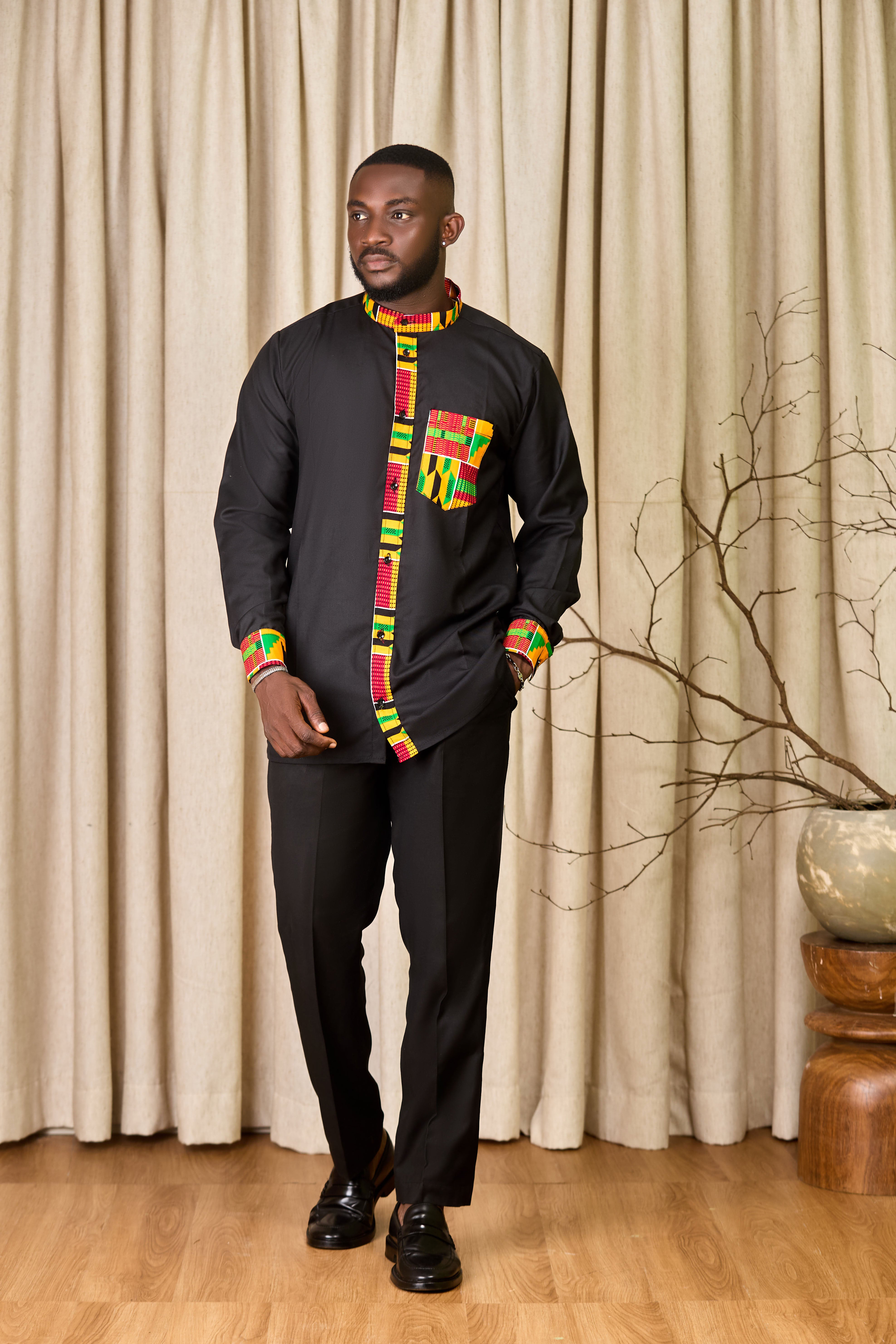A shirt that's soft on the outside, bold on the inside. Premium cashmere wraps you in comfort while vibrant kente fabric tape delivers serious style points. The front pocket keeps things practical without cramping your vibe. Whether you're dressing it up or keeping it casual, this piece works harder than it looks. Quality tailoring meets personality, exactly what a great shirt should be.