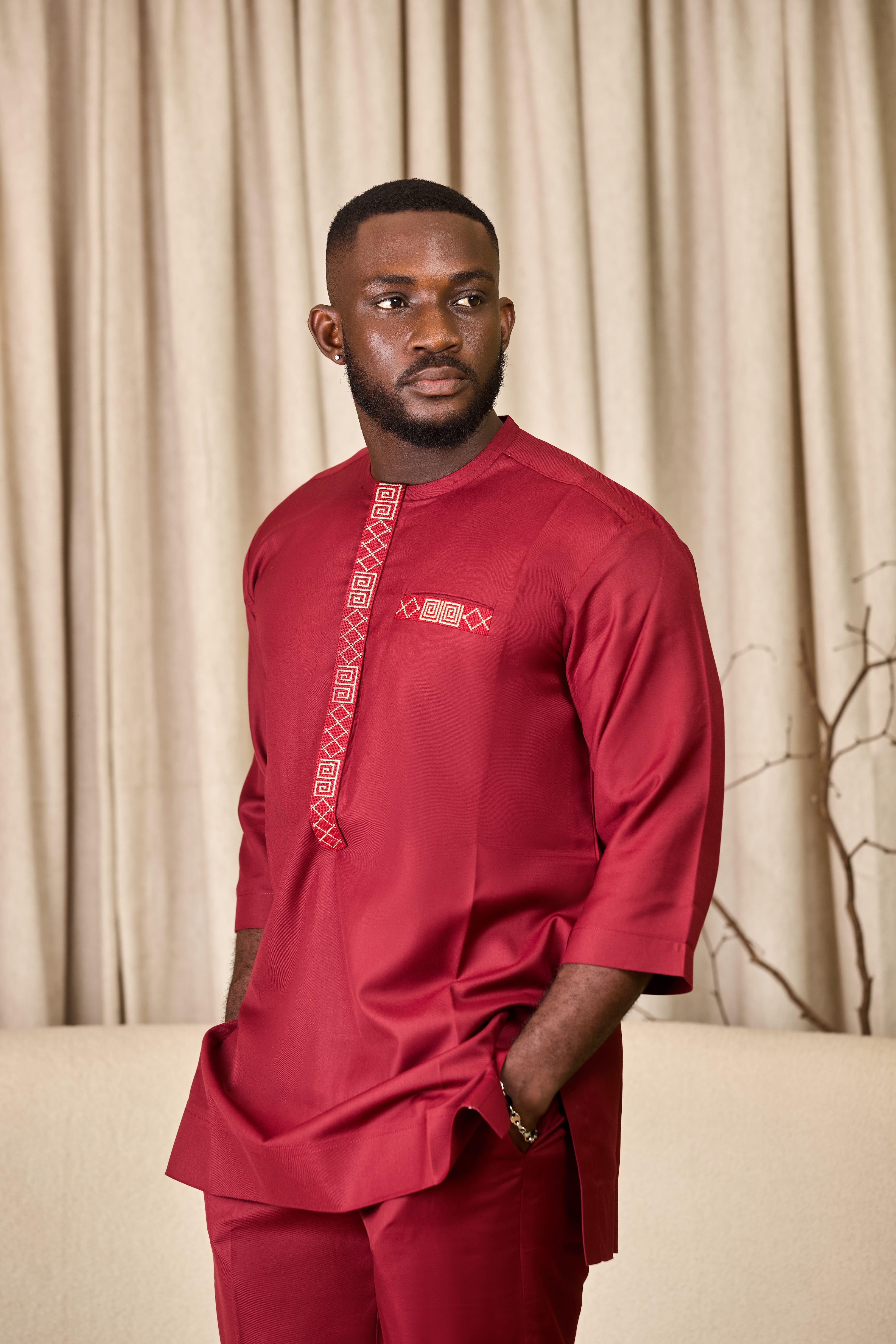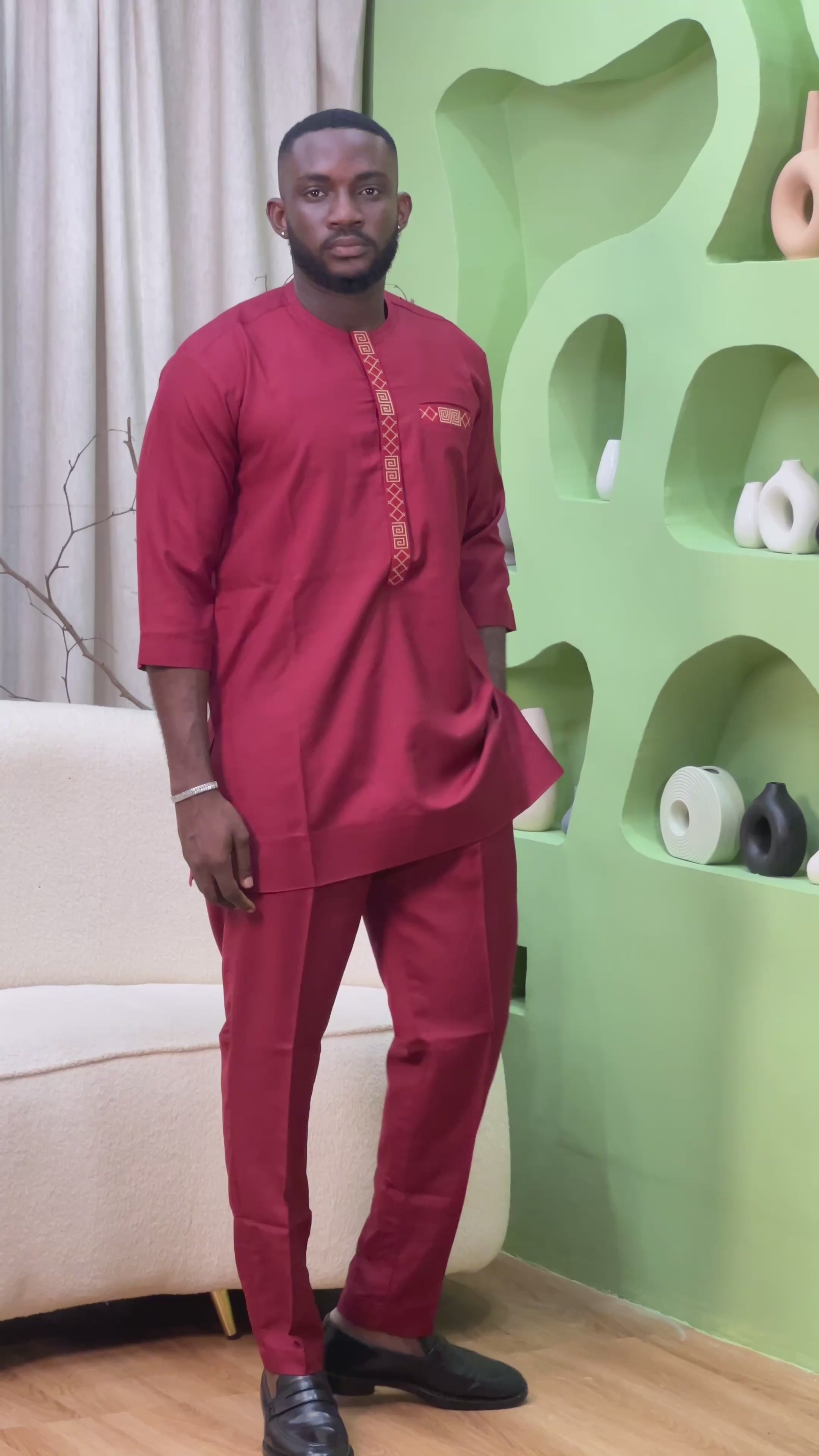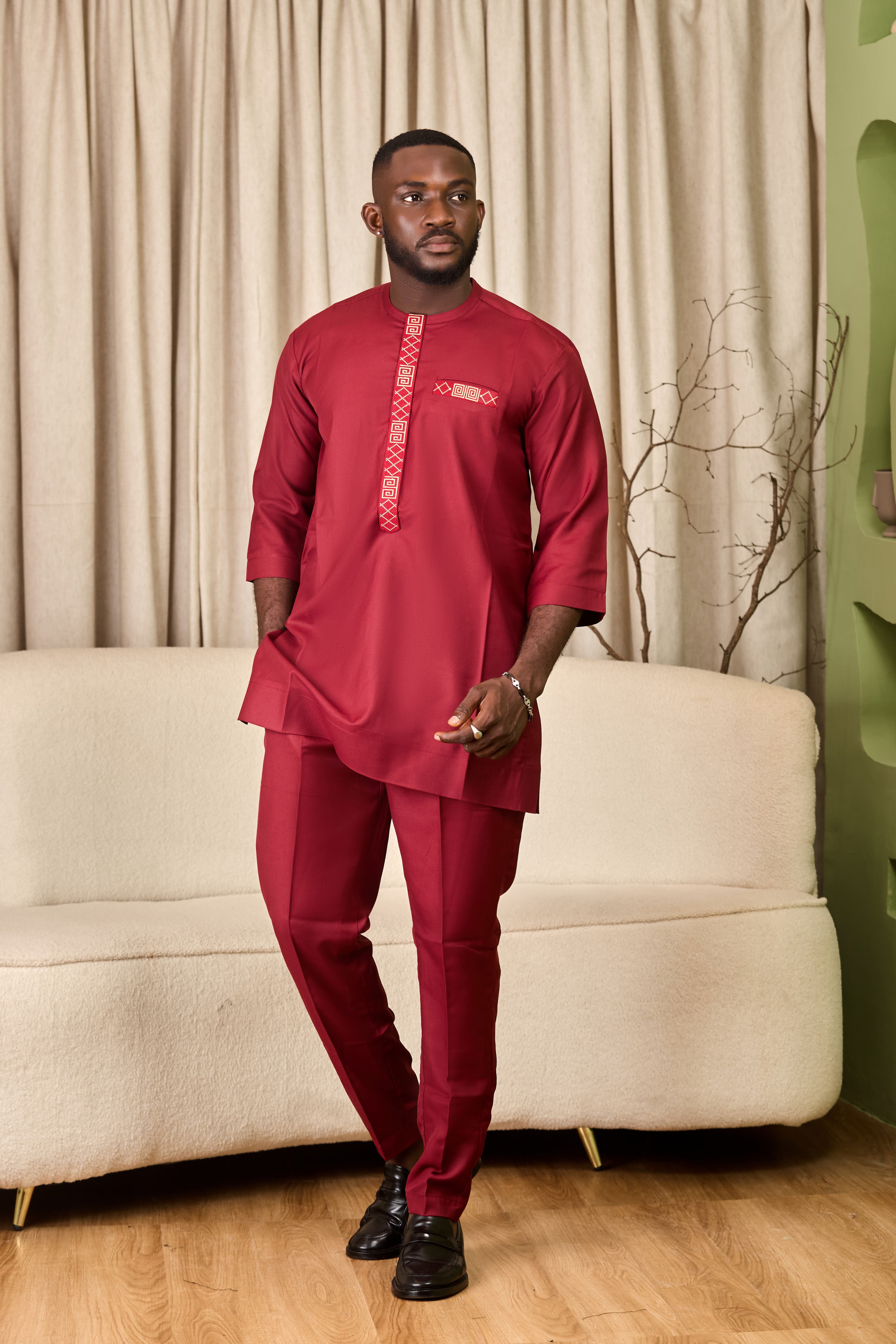 The top features subtle embroidery along the neckline and chest that adds just the right amount of detail without being too much. The matching trousers are neatly tailored, giving you a clean, modern fit that works for any occasion — from special events to casual gatherings.