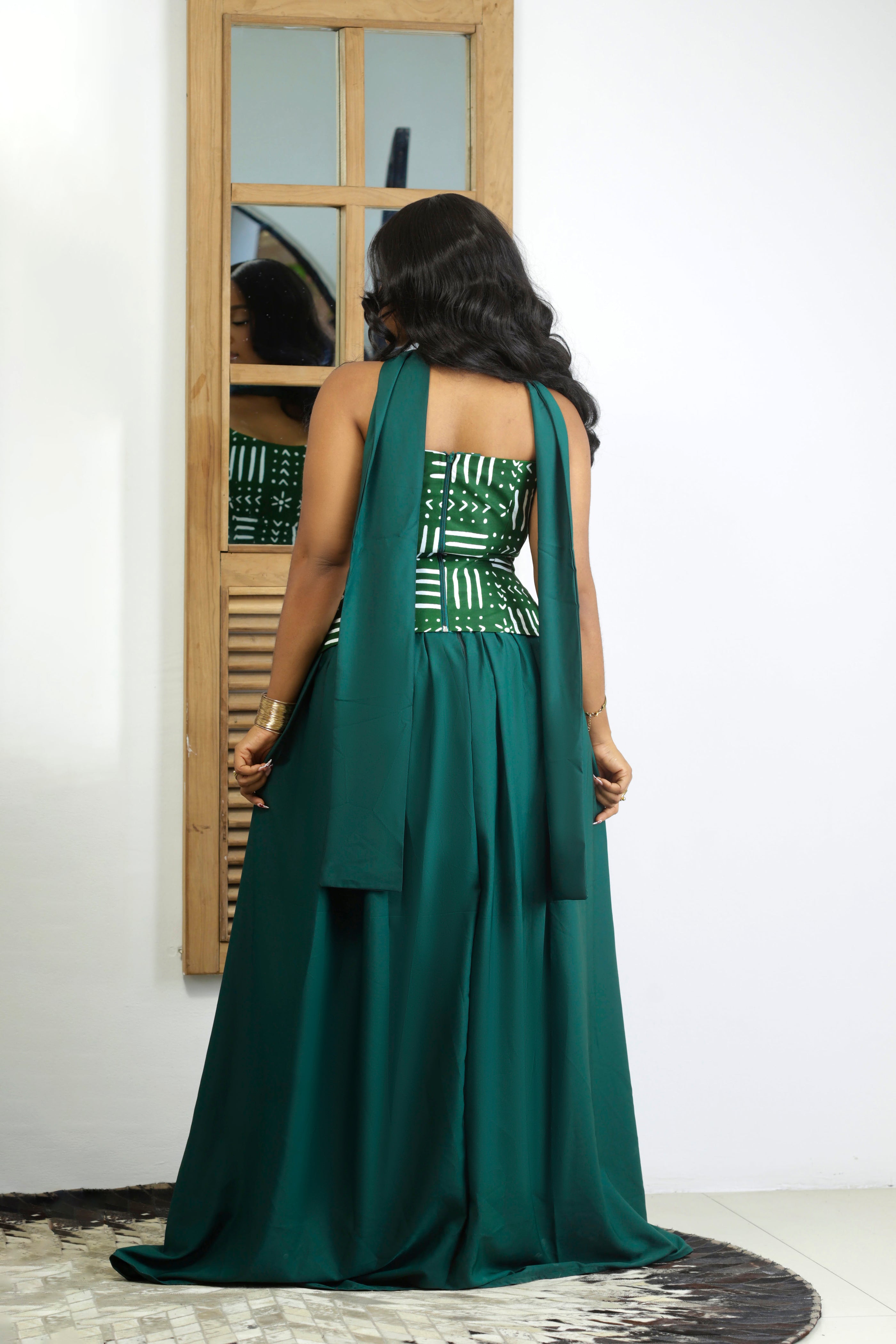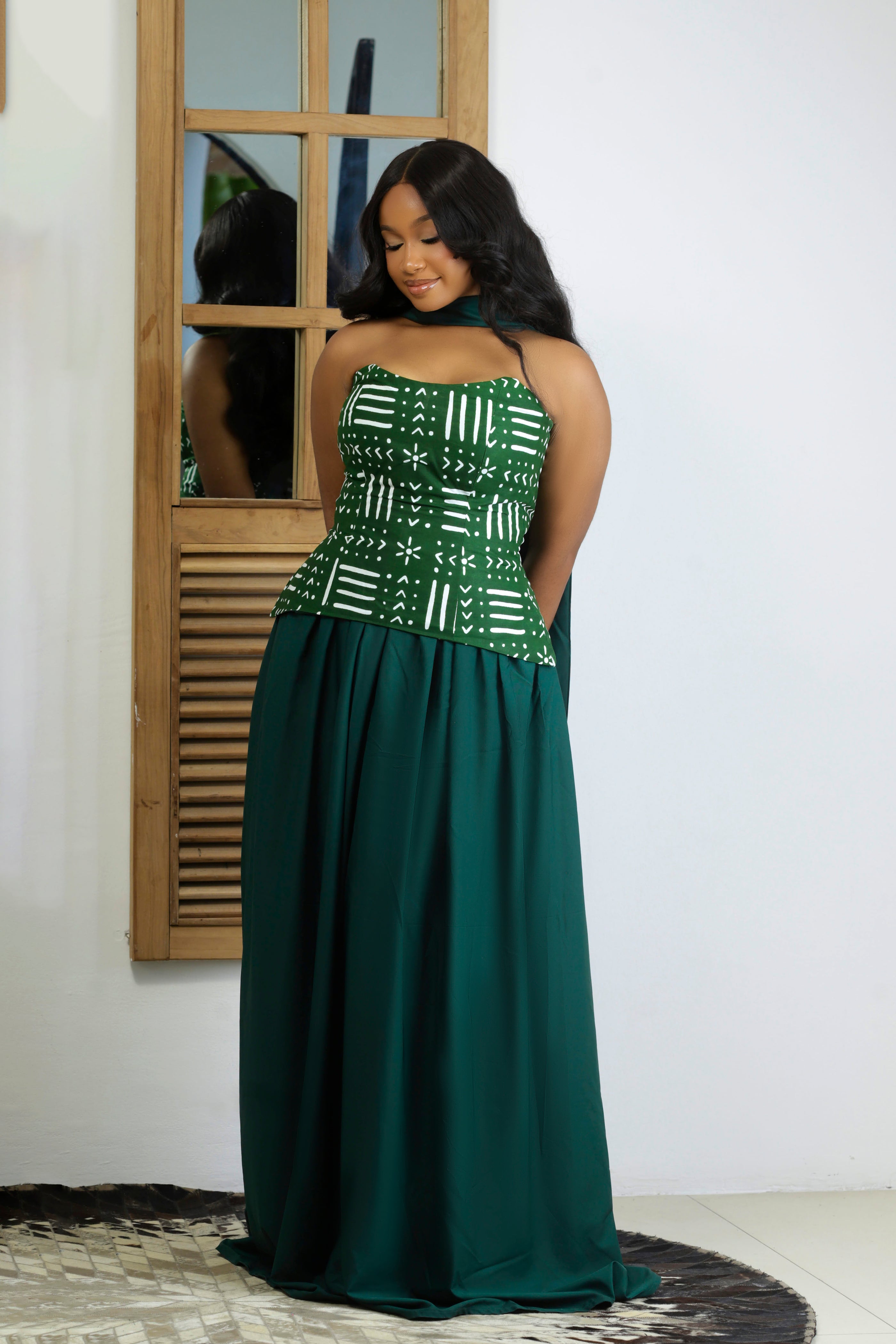 WHY YOU’LL LOVE IT• Three-piece set (corset top, maxi skirt & matching scarf)